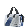 Eine mittelgroße Sport- und Freizeittasche aus recycelter LKW-Plane mit variablem Innenfach und praktischem Außenfach für schnellen Zugriff.